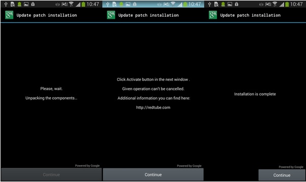 หลังจากคลิกที่ปุ่ม อุปกรณ์ของผู้ใช้จะถูกมัลแวร์ทำงานโดยเบื้องหลัง แอพพลิเคโทรจันที่ได้รับสิทธิ์ของผู้ดูแลอย่างเงียบๆ และตอนนี้สามารถล็อคอุปกรณ์ และทำการตั้งค่า PIN ใหม่สำหรับล็อคหน้าจอ