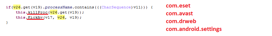 ในฐานะที่ Ransomware มีการป้องกันตนเองพิเศษที่ยังพยายามจะปิดกระบวนการการทำงานของโปรแกรมป้องกันไวรัส เมื่อผู้ใช้พยายามที่จะยกเลิกการใช้สิทธิ์ของผู้ดูแลอุปกรณ์ โทรจันพยายามที่จะป้องกันตัวเองจากโปรแกรมป้องกันไวรัสมือถือ 3 ยี่ห้อ ดังนี้ ESET Mobile Security, Avast และ Dr.Web