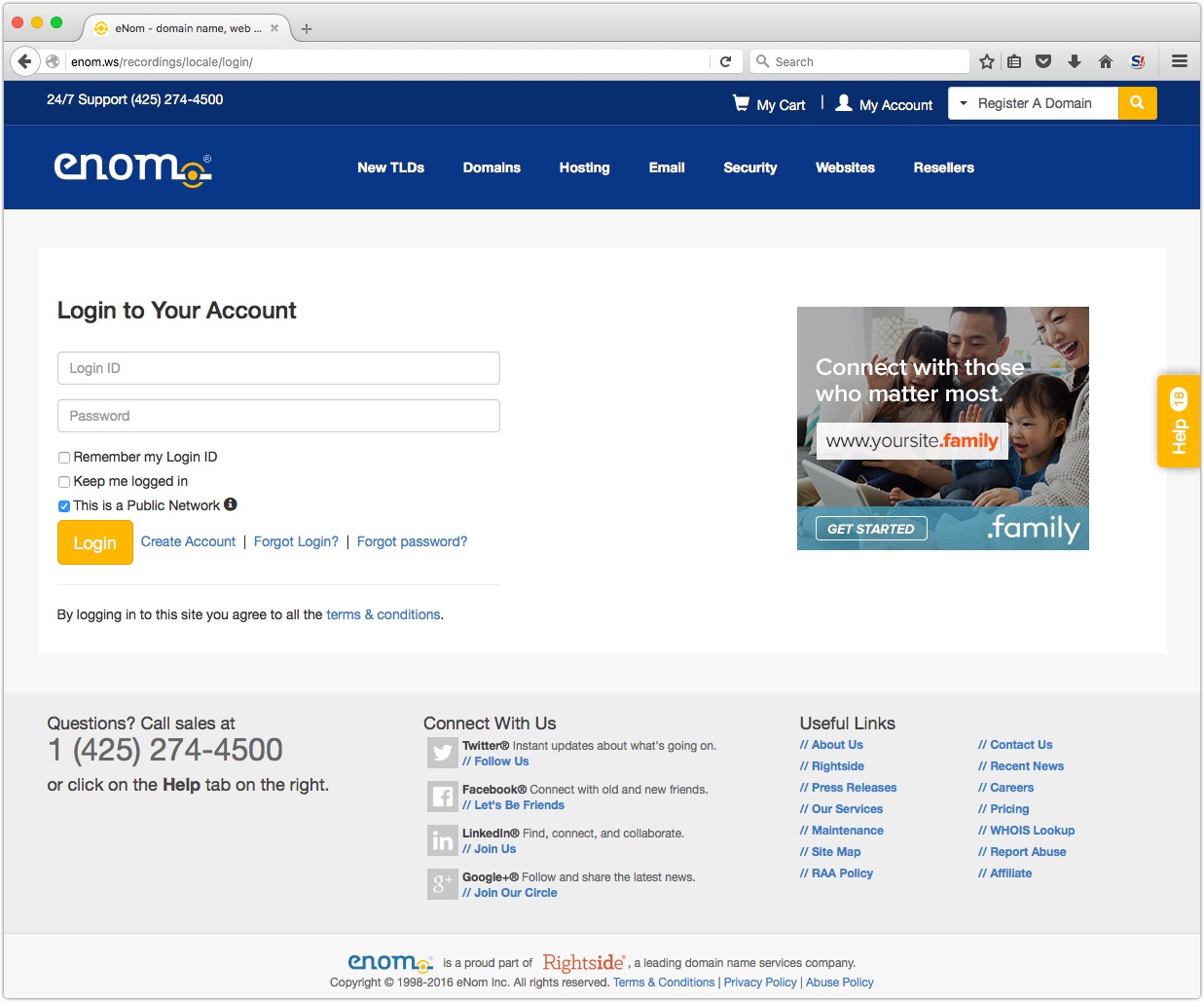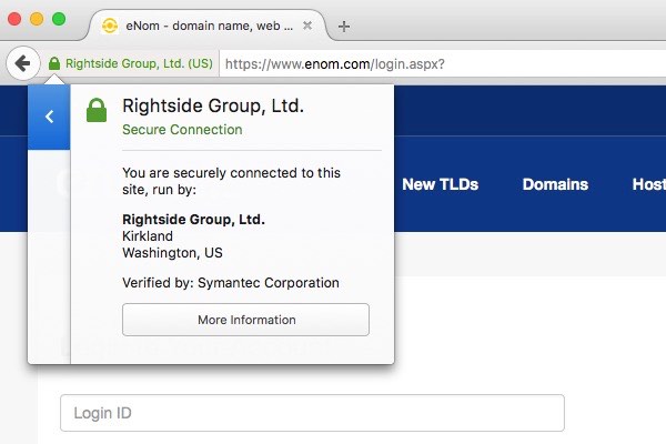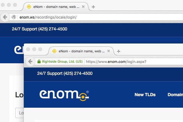 เว็บไซต์ enom.ws ที่ลิงก์มาจากอีเมล์ไม่ได้ใช้ HTTPS แต่ในขณะที่เว็บไซต์ของ enom.com มีใบรับรองและสัญลักษณ์กุญแจเขียวชัดเจน พร้อมด้วยชื่อของบริษัท Ringside