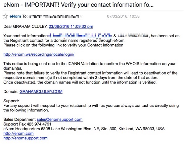 Subject: eNom – IMPORTANT! Verify your contact information for GRAHAMCLULEY.COM