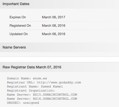 ความน่าสงสัยของเว็บไซต์ enom.ws มากขึ้นเมื่อผมใช้ระบบ WHOIS search และพบว่าโดเมนนี้ถูกสร้างขึ้นมาเมื่อวานนี้เอง