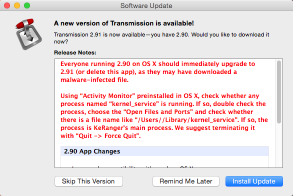 จากหน้าจอการแจ้งเตือนนี้ ซึ่งแสดงในการส่งผ่านแอปพลิเคชั่นและเว็บไซต์ ซึ่งเวอร์ชั่น 2.90 ของ BitTorrent ติดเชื้อ และผู้ใช้ได้รับคำแนะนำให้อัพเกรดเป็น 2.91โดยทันที ซึ่งจะทำให้ผู้ใช้ตกเป็นเหยื่อของโปรแกรมเรียกค่าไถ่แบบเข้ารหัสชื่อว่า KeRanger ที่มุ่งโจมตีระบบ OS X