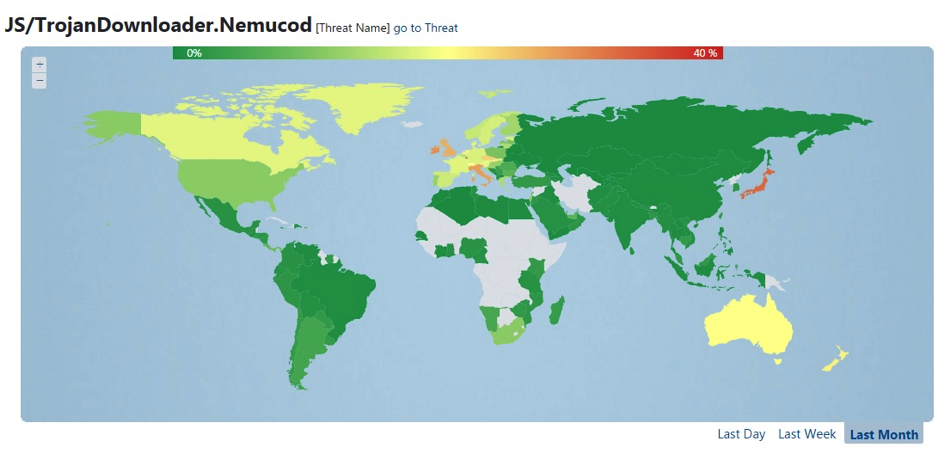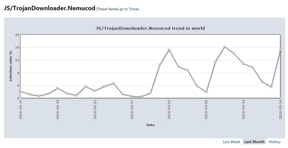 ตั้งแต่เดือนกุมภาพันธ์ที่ผ่านมา พวกเรากำลังเผ้าดูความเคลื่อนไหวของโปรแกรมเรียกค่าไถ่หลายชนิด ยกตัวอย่างเช่น Locky และ TeslaCrypt ใช้การแพร่กระจายด้วยมัลแวร์ JS/TrojanDownloader.Nemucod แผนการเหล่านี้ถูกจับได้หลายครั้งด้วย ระบบวัดและส่งข้อมูลทางไกลของ ESET อย่างเช่น LiveGrid® อย่างในประเทศญี่ปุ่นมีอัตราการตรวจจับถึง 80%
