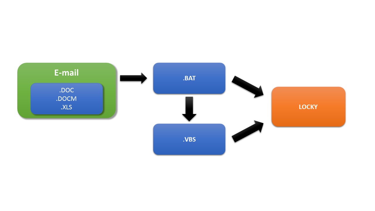 Chart ด้านล่างแสดงกระบวนการของ Locky ที่ใช้แทรกซึมเข้าสู่ระบบ ขั้นแรก ผู้ใช้จะได้รับอีเมล์หัวข้อหนึ่ง ที่ถูกแปลเป็นหลายภาษา และอีเมล์นี้แนบไฟล์นามสกุลที่สามารถเปิดได้ด้วยโปรแกรม Microsoft Office อย่างเช่น .DOC, .DOCM หรือ .XLS เอกสารเหล่านี้จะสร้างไฟล์นามสกุล .BAT ที่สามารถแปลงเป็นโค้ด VBScript หลังจากนั้นไฟล์เหล่านี้จะดาวน์โหลดไฟล์ไวรัสตัวจริงที่ชื่อ Win32/Filecoder.Locky