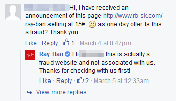 หลายคนถูกหลอกล่อด้วยคำว่า “ส่วนลด” วิธีการรับมือง่ายๆ คือติดต่อเฟสบุ๊คต้นสังกัดของ Ray-Bans ว่ามีแคมเปญจน์นี้จริงหรือไม่ เพราะตัวแทนของ Ray-Bans กำลังทำงานอย่างหนักเพื่อตอบคำถามเกี่ยวกับเพจปลอมเหล่านี้