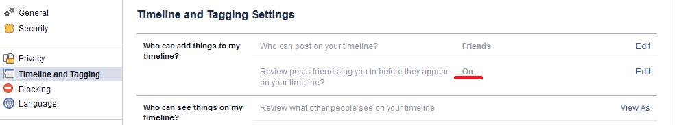 ถ้าคุณไม่ต้องการเป็นหนึ่งในผู้เผยแพร่โฆษณาปลอมต่อเพื่อนบนเฟสบุ๊ค คุณสามารถตัดสินใจโพสที่เพื่อนคุณแทคมา ก่อนที่จะแสดงบนไทม์ไลน์ โดยการเปิดใช้คุณลักษณะได้ที่ Setting -> Timeline and Tagging -> Review posts friends tag you in before they appear on your timeline? -> Enable