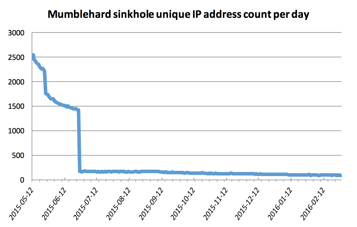 จากกราฟจะเห็นได้ว่าจำนวนของ Mumblehard ลดลงอย่างเห็นได้ชัด ด้วยไอพี แอดเดรส เพียงไอพีเดียว ก็เพียงพอที่จะหยุดกิจกรรมของ botnet ได้ ดังนั้นพวกเราจึงจัดการติดต่อบุคคลที่เกี่ยวข้องเพื่อดำเนินการ และหลักจากการ Takedown พวกเราไม่เห็นสายพันธุ์ใหม่ของ Mumblehard ปรากฎตัวจนถึงตอนนี้