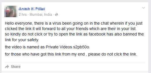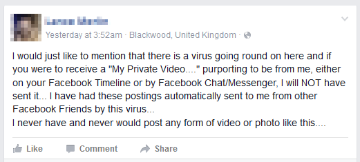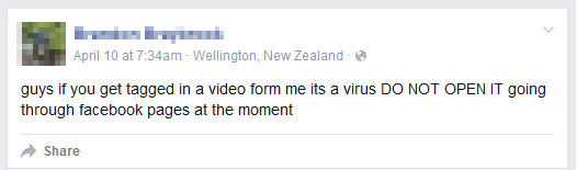 ครั้งนี้ลิงก์อันตรายปลอมตัวเป็นโพสบนไทม์ไลน์พร้อมแทคชื่อของคุณ หรือเป็นข้อความโดยตรงที่มาจากเพื่อนของคุณ โดยใช้ชื่อเรื่อง “My first video”, “My video”, “Private video” หรือตัวอักษรมั่วๆเรียงกันเหมือนรหัสอะไรสักอย่าง และแทคบุคคล ตามรายชื่อเพื่อนของเป้าหมาย เพื่อหลอกให้คลิก