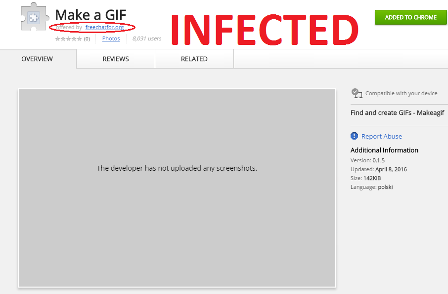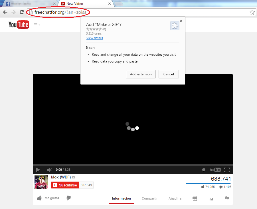 หลักจากคลิก “Add Extension” บนหน้าเว็บไซต์ Youtube ปลอมโค้ดอันตรายจะติดตั้ง Plug-in ที่ติดโทรจันเอาไว้ (บรรจุโค้ด Java Script อันตราย) บนเบราเซอร์ Google Chrome ในรูปแบบใกล้เคียงกับ Plug-in “Make a GIF” แตกต่างเพียงชื่อผู้พัฒนา “freechatfor.org”