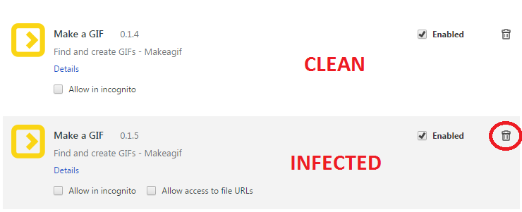 ถ้าหากคุณติดตั้ง Plug-in “Make a GIF” ของจริงเอาไว้ พวกเรามีตัวอย่างรูปความแตกต่างของเวอร์ชั่นจริง และเวอร์ชั่นที่เป็นไวรัส