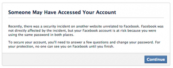 เร็วๆนี้เกิดเหตุการณ์เกี่ยวกับความปลอดภัยกับเว็บไซต์ที่ไม่เกี่ยวข้องกับ Facebook และทาง Facebook ไม่ได้รับผลกระทบใดๆจากเหตุการณ์เหล่านั้น แต่บัญชีของคุณอาจมีความเสี่ยงหากคุณให้รหัสผ่านเดียวกันทั้งสองเว็บไซต์