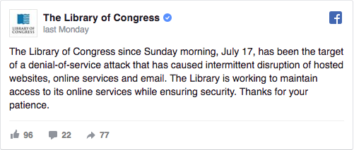 บนโซเชี่ยลมีเดียเปิดเผยว่าห้องสมุดของรัฐสภาสหรัฐอเมริกาเผชิญกับ Distributed Denial of Service หรือ DDoS ที่เป็นการส่งทราฟฟิคเข้าเว็บไซต์จำนวนมากเกินกว่าที่ระบบจะรับไหวจนทำให้ระบบใช้งานไม่ได้