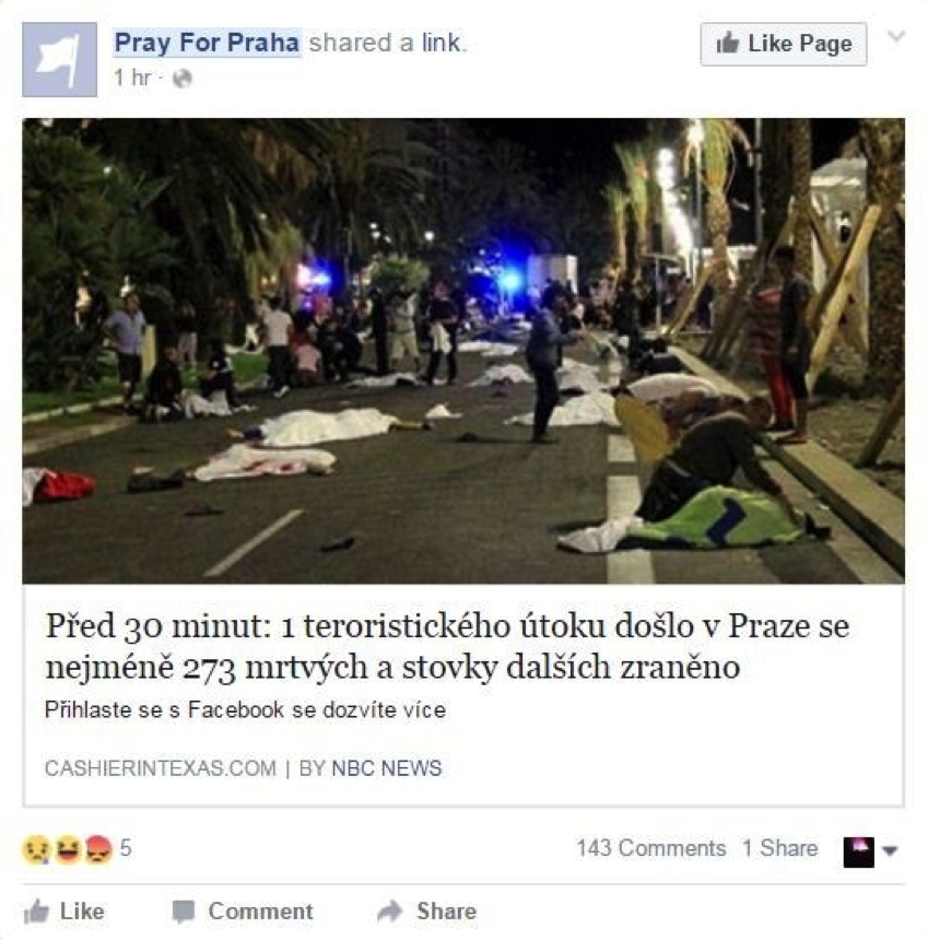 ยกตัวอย่างที่เกิดขึ้นในสาธารณรัฐเช็กจากรายงานข่าว(ปลอม) “deadly attack in Prague” ซึ่งใช้โอกาสเปิดตัวเมื่อสำนักงานรายงานข่าว ที่กำลังเป็นที่สนใจของประชาชนคนในประเทศ
