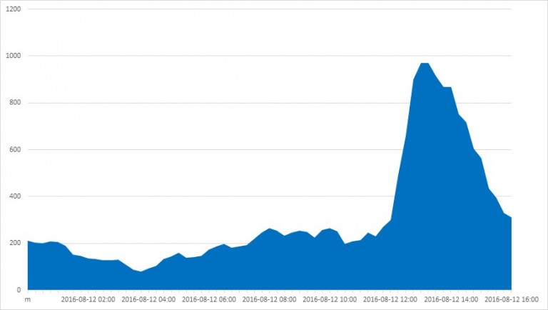กราฟแสดงการแพร่กระจาย JS/Danger.ScriptAttachment ใน Brazil เมื่อวันที่ 12 สิงหาคม 2559