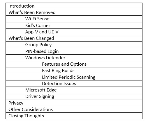 โดยฟังก์ชันที่ถูกนำออกไปเช่น Wi-Fi Sense และ Kid’s Corner และเปลี่ยนเป็น Group Policy และ PIN-based login และเวอร์ชันล่าสุดของ WIndows Defender และ Microsoft Edge นอกจากนี้เรายังให้ความสนใจกับประเด็นอัพเดทอื่นๆของ Windows 10 และการเปลี่ยนที่ตามมากับผู้ใช้ในบ้าน และธุรกิจหลังจากการอัพเดท ซึ่งสรุปได้เป็นตารางดังนี้