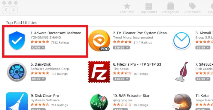 แอปพลิเคชั่น “Adware Doctor” แอปพลิเคชั่น Utility อันดับ 1 ขายในราคา 4.99 เหรียญสหรัฐฯ และเสนอตัวเองว่าเป็น “best app” to prevent “malware and malicious files from infecting your Mac.”