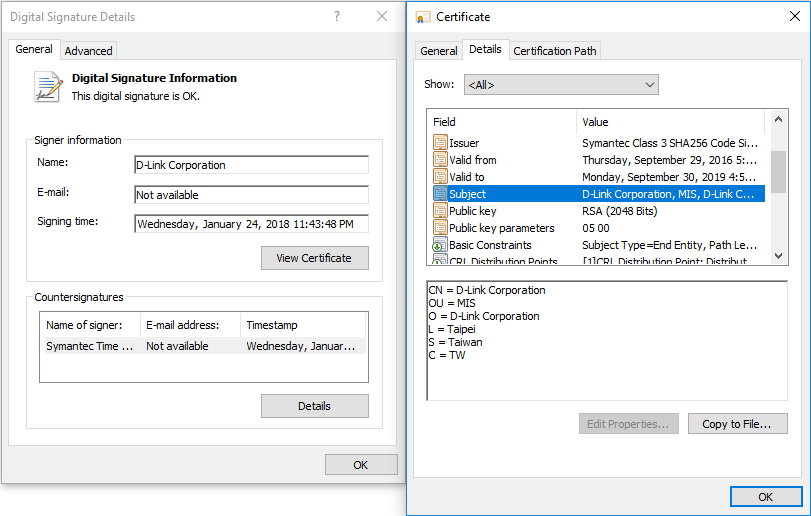 เราพบแผนการมัลแวร์ที่มีไฟล์น่าสงสัยที่ใช้ D-Link Corporation code-signing certificate ซึ่งเป็น Certificate เดียวกับซอฟต์แวร์ของ D-Link เนื่องจากโดนขโมยไป