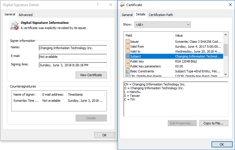 นอกจาก Certificate ของ D-Link นักวิจัยของ ESET ได้วิเคราะห์ตัวอย่างของ Certificate ที่ได้จากองค์กรความปลอดภัยของไต้หวัน Changing Information Technology Inc.