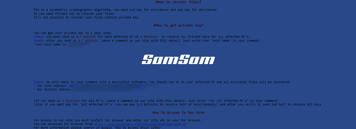 SamSam เป็นโปรแกรมเรียกค่าไถ่ที่มีเป้าหมายเป็นสถานพยาบาลและองค์กรของรัฐ เริ่มทำงานมาตั้งแต่ 2016 แพร่กระจายด้วยการแฮกและติดตั้งโปรแกรมเรียกค่าไถ่ ผ่าน Remote Desktop Services และใช้เครื่องนั้นเป็นตัวการในการเข้ารหัสไฟล์คอมพิวเตอร์เครื่องอื่นในเครือข่าย