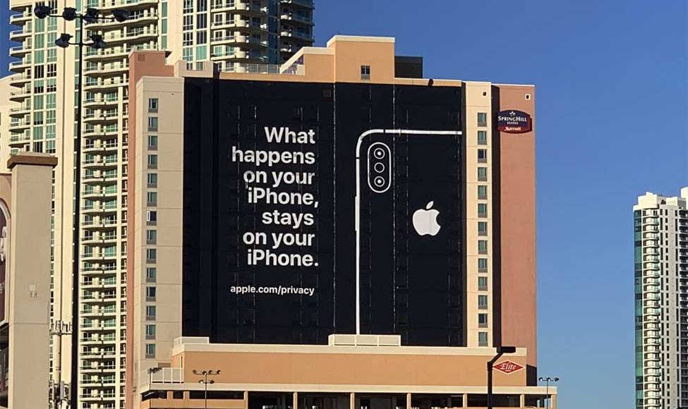 แต่ในปีนี้ Apple มีป้ายโฆษณาใหญ่ใกล้สถานที่จัดงาน CES ที่มีเนื้อหาเหน็บแนมคู่แข่งอย่าง Google และ Amazon เกี่ยวกับประเด็นความเป็นส่วนตัว (Privacy)