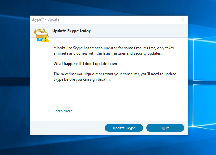 หากผู้ใช้ติดตั้ง Skype Classic (7.41.0.10101) และในบางครั้งเมื่อเปิดโปรแกรมจะมีข้อความ “Update Skype today” เพื่อให้ดาวน์โหลดและติดตั้ง Skype 8 หรือออกจาก Skype ทันที