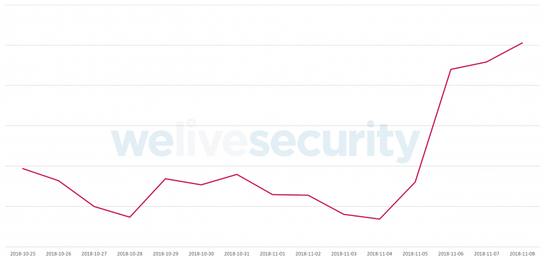 จากการตรวจจับของเราพบว่ากิจกรรมล่าสุดของ Emotet เกิดขึ้นเมื่อวันที่ 5 พฤศจิกายน 2018 จากที่เคยเงียบมาก่อนหน้านี้ ซึ่งในรูปภาพถัดไปคุณจะได้เห็นอัตราการตรวจจับ Emotet ที่เพิ่มขึ้นอย่างมากในช่วงต้นเดือนพฤศจิกายน