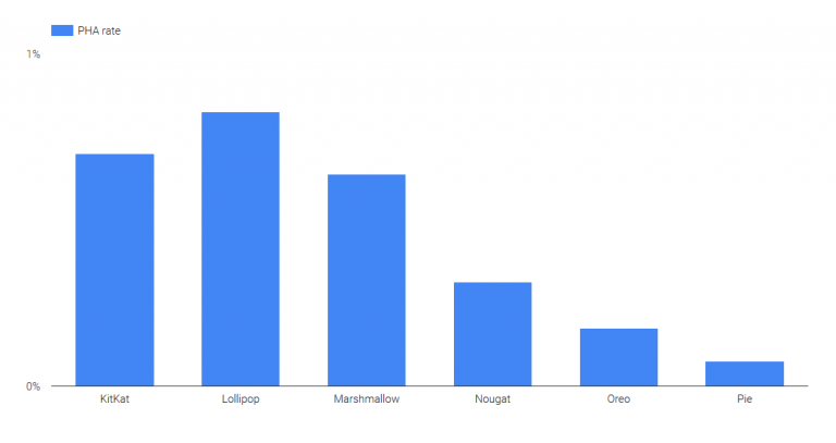 ระบบปฏิบัติการแอนดรอยด์เวอร์ชั่นใหม่จะได้รับผลกระทบจากแอปพลิเคชั่นที่อาจเป็นอันตราย (PHA) น้อยลง นับจากแอนดรอยด์ Lolipop เวอร์ชั่น (5.x) ที่นับเป็นเวอร์ชั่นที่มี PHA สูงที่สุด และลดลงมาเรื่องจนกระทั่งแอนดรอยด์เวอร์ชั่น Pie (9.x)