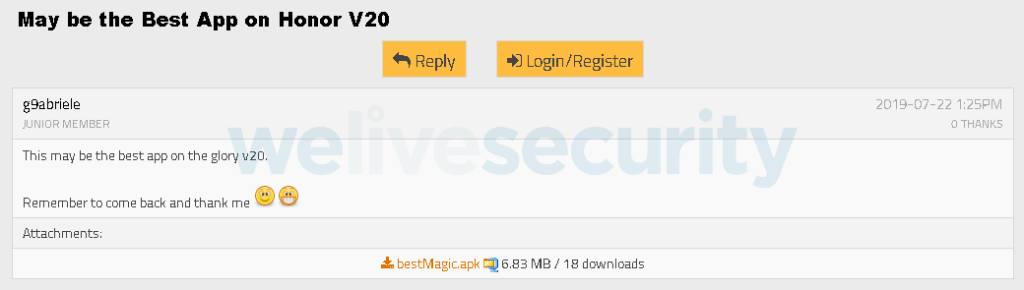 Android/Filecoder.C เริ่มทำงานมาตั้งแต่ 12 กรกฎาคม 2019 เป็นอย่างน้อย พวกเขาปล่อยลิงก์อันตรายผ่านโพสต์ในฟอรั่มของ Reddit และ “XDA Developers” ซึ่งทางเราแจ้งไปยังสองเว็บไซต์นี้แล้ว ทาง XDA Developers เอาโพสต์ออกอย่างรวดเร็ว แต่ ณ เวลาที่เขียนบทความนี้ โพสต์บน Reddit ยังคงอยู่