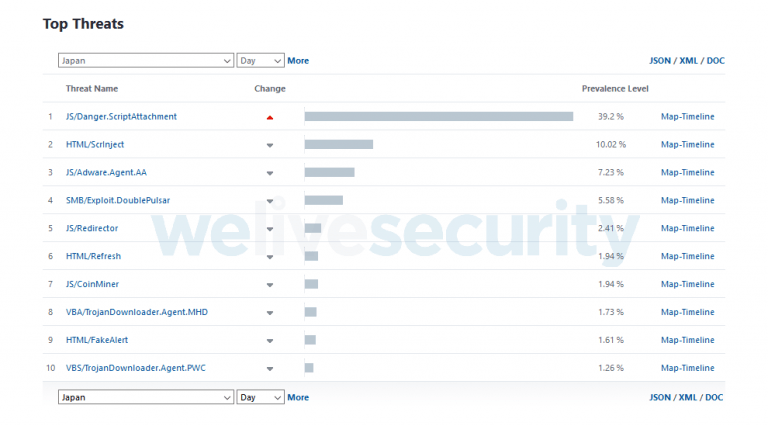 วันที่ 29 มกราคม 2019 พบการตรวจจับส่วนมากอยู่ในญี่ปุ่น (95%) และมีอีเมลนับหมื่นอีเมลถูกปล่อยออกมาทุกชั่วโมง ซึ่ง JS/Danger.ScriptAttachment — JavaScript อันตรายที่แพร่กระจายผ่านอีเมล ติดอันดับ 4 ของภัยคุกคามที่ระบาดหนักที่สุดทั่วโลก และเป็นอันดับ 1 ในประเทศญี่ปุ่น