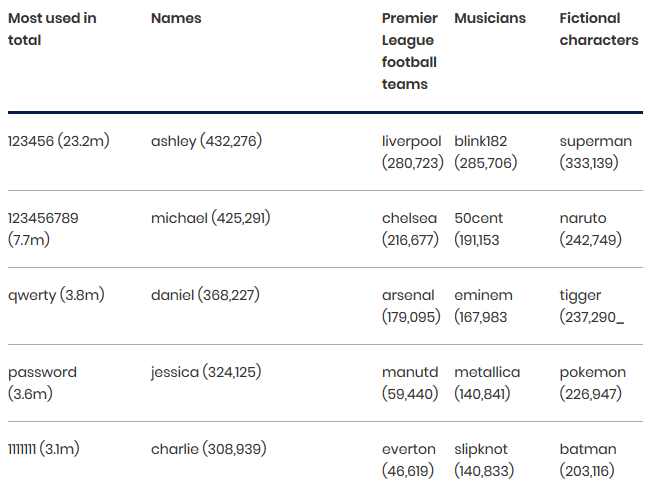 ข้อมูลจาก Have I Been Pwned (HIBP) เว็บไซต์ที่รวบรวมฐานข้อมูลบัญชีที่ถูกแฮกเอาไว้ เพื่อให้คนสามารถตรวจสอบว่าบัญชีของตัวเองเป็นหนึ่งในนั้นหรือไม่ หน่วยงาน National Cyber Security Centre (NCSC) ของอังกฤษเปิดเผยว่าพวกเขาพบผู้ใช้ 23.2 ล้านรายที่ใช้รหัสผ่าน ‘123456’ และมี 7.7 ล้านรายที่ใช้รหัสผ่าน ‘123456789’ ซึ่งเปิดโอกาสให้อาชญากรไซเบอร์สามารถเข้าถึงตัวผู้ใช้ ยังมีรหัสผ่านอื่นๆที่คนมักใช้อย่าง ‘qwerty’, ‘password’ และ ‘1111111’