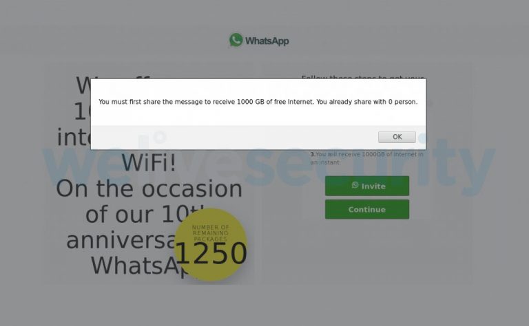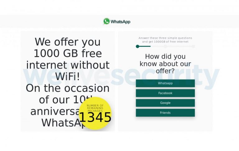 นักวิจัยของ ESET ในภูมิภาคละตินอเมริกาได้รับข้อความว่ามีอินเตอร์เน็ต 1000 GB แจกฟรีเนื่องในโอกาศฉลองครบรอบของ WhatsApp แต่เหมือนว่าดูแล้วจะไม่ได้เป็นอย่างนั้น