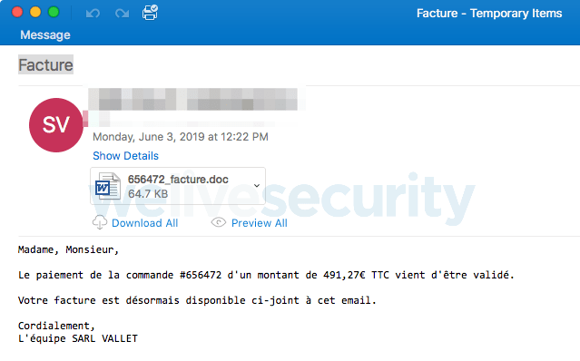 ในอีเมลบอกว่ามีบิลมูลค่า 491.27 ยูโรแนบมา และแนบไฟล์ที่มีคำว่า “facture” ซึ่งแปลว่าบิล ซึ่งจะทำให้ผู้ใช้เปิดไฟล์