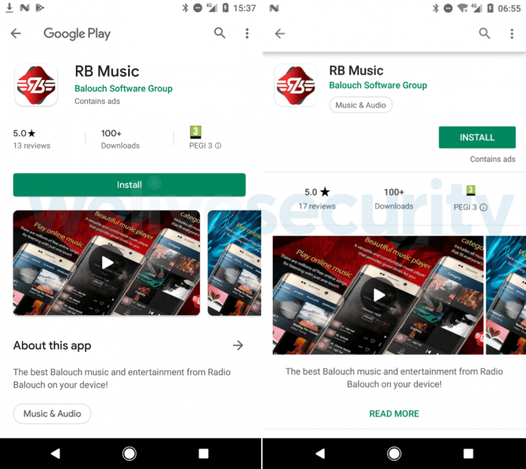 แอปพลิเคชั่นอันตราย Radio Balouch หรือ RB Music เดิมทีเป็นแอปพลิเคชั่นวิทยุสำหรับผู้ติดตามเพลงของ Balouchi แต่มีการขโมยข้อมูลผู้ใช้ ก่อนที่จะโดนแจ้งให้นำแอปพลิเคชั่นออกจาก Google Play