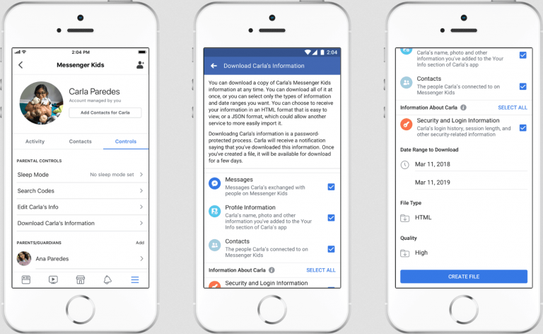 คุณสามารถดาวน์โหลดข้อมูลเด็กๆจาก Messenger Kids เหมือนที่คุณทำบน Facebook ของคุณได้ “ดาวน์โหลดไฟล์รายชื่อผู้ติดต่อ ข้อความ รูปภาพ และวิดีโอ แต่เด็กๆจะเห็นการแจ้งเตือนว่าคุณดาวน์โหลดข้อมูล” คุณ Brown กล่าว