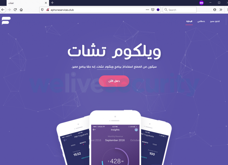 โดย Welcome Chat ปลอมถูกนำไปโฆษณาในภูมิภาคตะวันออกกลาง แม้จะถูกแบนในหลายประเทศ โดเมนเว็บไซต์ของพวกเขาจดทะเบียนเมื่อเดือนตุลาคม 2019