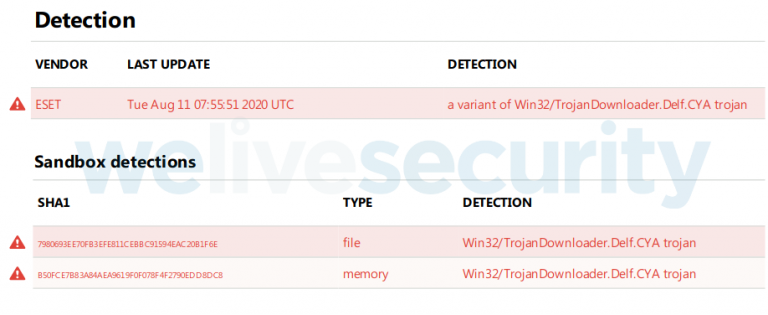 ผลิตภัณฑ์ของ ESET สามารถตรวจจับได้ในชื่อ Win32/TrojanDownloader.Delf.CYA ที่ดาวน์โหลดมัลแวร์เข้าระบบ ทั้ง Grandoreiro, Casbaneiro, Mekotio และ Mispadu