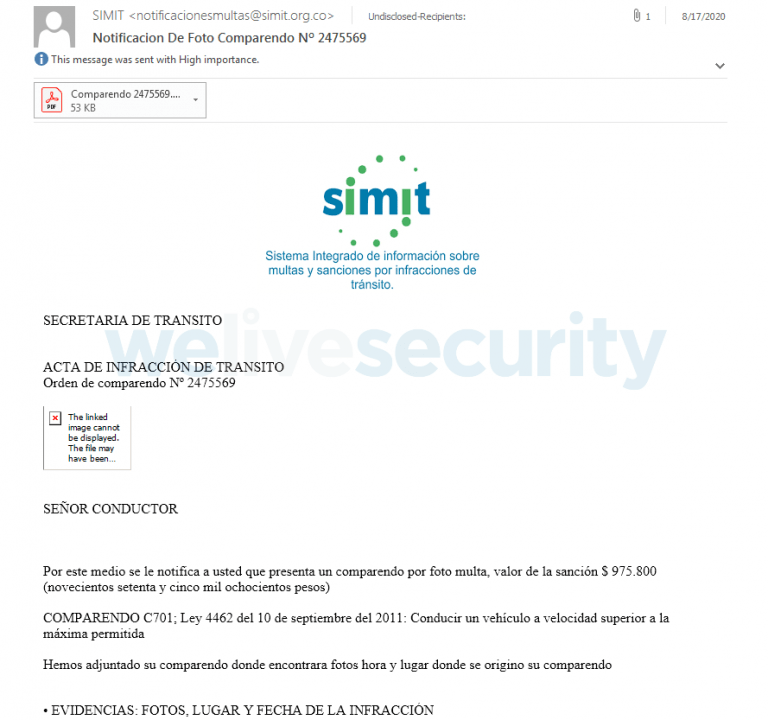 ต่อไปจะเป็นตัวอย่างอีเมลค่าปรับจำนวน 250 เหรียญข้อหาละเมิดกฎหมายขับขี่ ซึ่งในอีเมลจะบอกว่าพวกเขาแนบไฟล์รูปภาพการฝ่าฝืน และข้อมูลวันเวลา หากเราเปรียบเทียบจะพบว่าอีเมลของพวกเขากับอีเมลจาก SIMIT (ช่องทางชำระเงินค่าปรับ) ของโคลัมเบียมาก