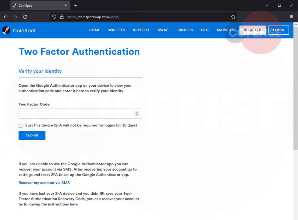 หากผู้ใช้กรอกข้อมูลอีเมลและรหัสผ่าน ไม่ว่าจะถูกต้องหรือไม่ ผู้ใช้จะถูกพาไปยังหน้ายืนยันตัวตนด้วยรหัส OTP (One-Time Password) สุดท้ายเพื่อความแนบเนียนผู้ใช้จะถูกไปยังหน้า Official ของ CoinSpot