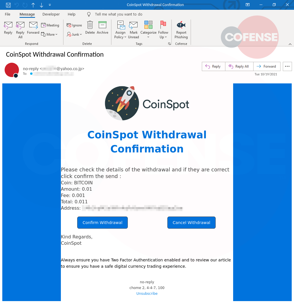 พวกเขาใช้โดเมน Yahoo ในการส่งอีเมล โดยเลียนแบบหน้าตาอีเมลจาก CoinSpot ที่มีเนื้อหาเกี่ยวกับการยืนยันหรือยกเลิกการถอนเงิน