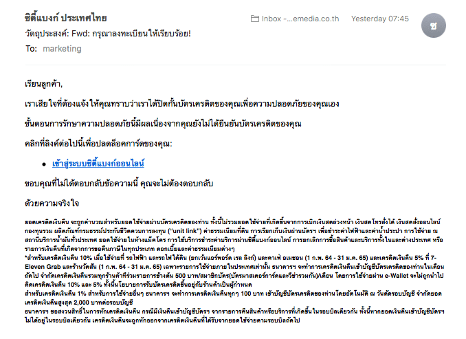 แต่ในกรณีที่เราเห็นนี้ค่อนข้างชัดเจนว่าเป็นมิจฉาชีพหรืออาชญากรไซเบอร์ สิ่งที่เราได้ก็คือการลบอีเมลนี้ทิ้งหรือรายงานไปทางธนาคารว่ามีคนกำลังแอบอ้างและโจมตีลูกค้าของธนาคารอยู่