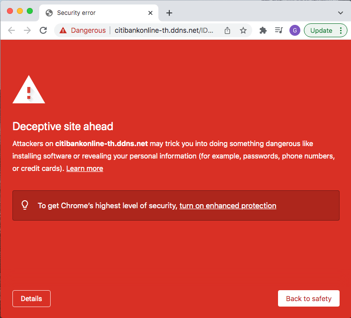 หากผู้ใช้คลิกที่ลิงก์ “เข้าสู่ระบบซิตี้แบงก์ออนไลน์” จะถูกพาไปยังหน้าเว็บไซต์ที่แฮกเกอร์เตรียมขึ้นมา แต่ในกรณีนี้เบราว์เซอร์ Google Chrome ของเราสามารถตรวจจับได้ว่าเว็บไซต์นี้เป็น Phishing หรือเว็บไซต์ขโมยข้อมูล