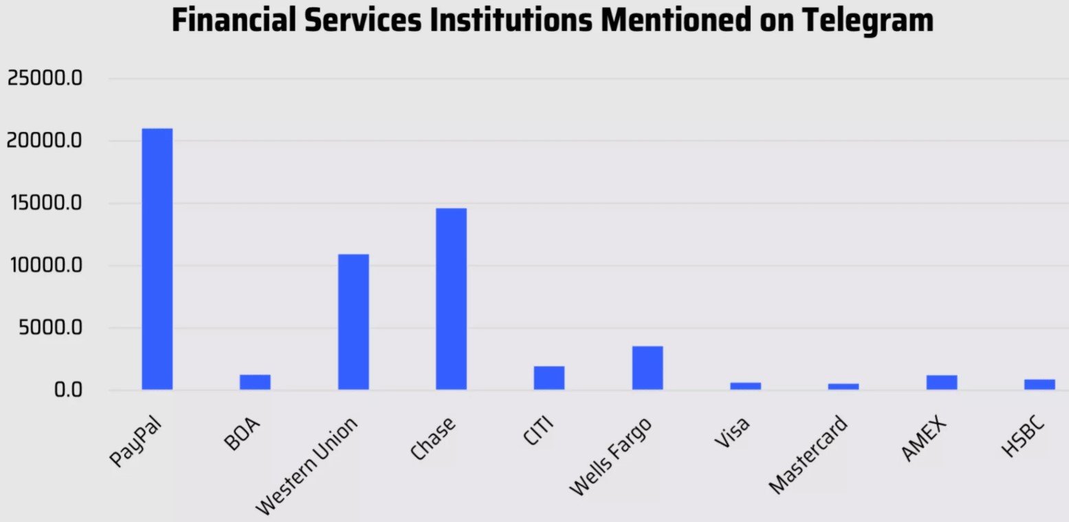 Cybersixgill ให้ข้อมูลว่าบัญชี PayPal ถูกโจมตีมากที่สุด เนื่องจาก PayPal สามารถดึงเงินจากผู้ใช้ได้ง่าย และสามารถสั่งซื้อสินค้าได้หลากหลายแพลตฟอร์ม