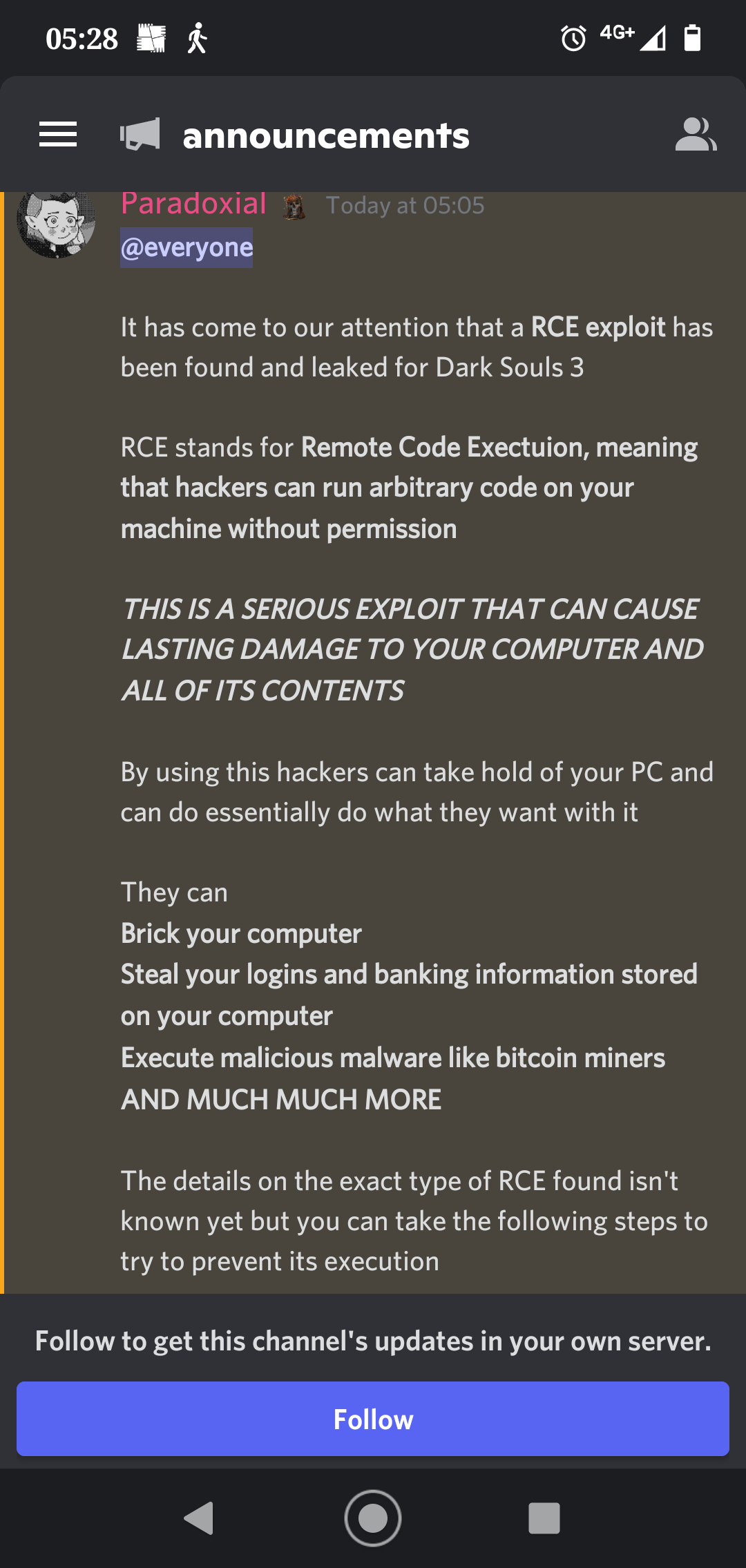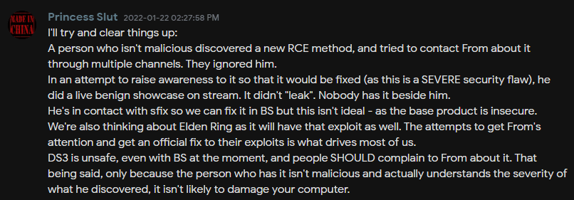 จากข้อมูลใน Reddit มีการพบช่องโหว่ในระบบ RCE (Remote Code Execution) ที่ทำให้แฮกเกอร์สามารถควบคุมระบบของเกม Dark Souls เข้าถึงข้อมูลสำคัญ หรือติดตั้งไวรัสมัลแวร์ได้