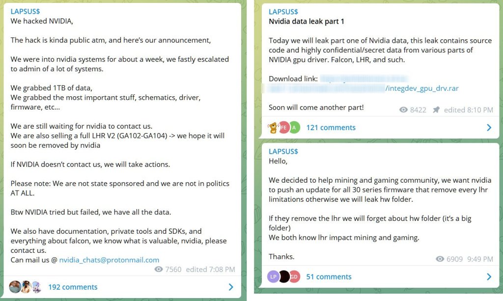 ช่วงเสาร์อาทิตย์ที่ผ่านมากลุ่มแฮกเกอร์ Lapsus$ ให้ข้อมูลเพิ่มเติมเกี่ยวกับการโจมตี เช่น ปริมาณข้อมูลกว่า 1TB ที่เป็นกรรมสิทธิ์ของ Nvidia และข้อมูลรหัสผ่านของพนักงาน