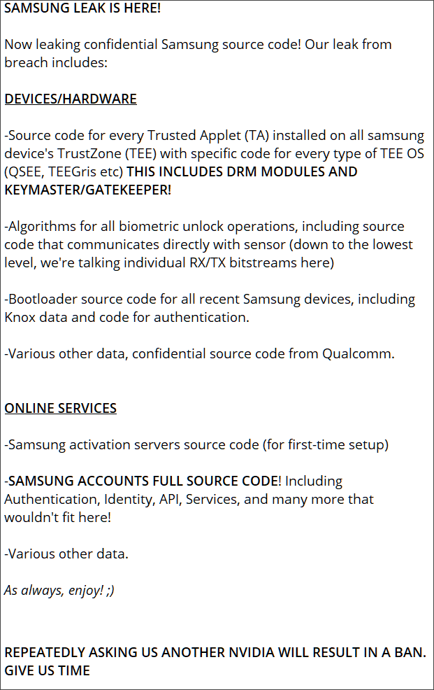ตัวแทนของ Samsung บอกว่าแฮกเกอร์ไม่มีคำเรียกร้องใดๆ ก่อนที่จะปล่อยข้อมูลบนอินเตอร์เน็ต แต่กลับกันกับที่เกิดขึ้นกับ Nvidia ที่แฮกเกอร์ชะลอการปล่อยข้อมูลเพื่อต่อรอง