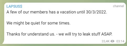 แต่ถึงอย่างนั้นเราก็ไม่ทราบว่ากลุ่ม Lapsus$ มีสมาชิกทั้งหมดกี่คน แต่จากกลุ่มใน Telegram ก็ทำให้เราเห็นว่ากลุ่ม Lapsus$ มีสมาชิกที่ใช้ภาษาอังกฤษ รัสเซีย ตุรกี เยอรมัน และโปรตุเกส