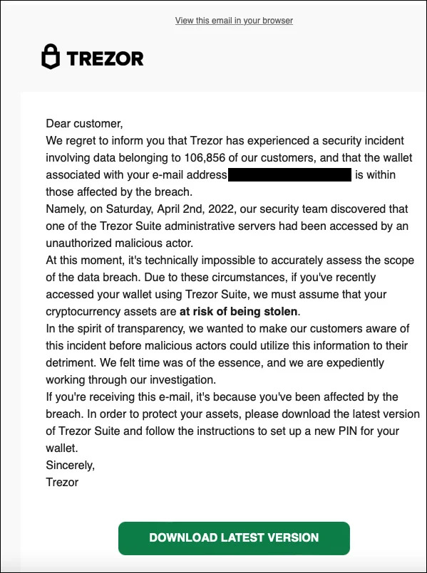 Source: https://www.bleepingcomputer.com/news/security/fake-trezor-data-breach-emails-used-to-steal-cryptocurrency-wallets/