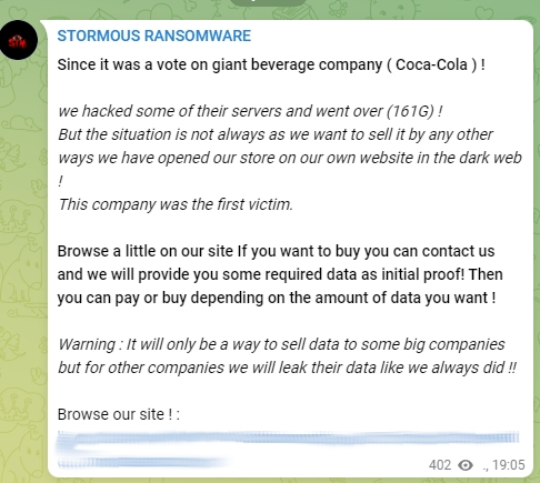 ทาง Coca-Cola เริ่มตรวจสอบเหตุการณ์หลังจากกลุ่มแฮกเกอร์ Stormous ออกมาเคลมว่าพวกเขาได้ข้อมูลขนาดกว่า 161GB จากเซิร์ฟเวอร์ของ Coca-Cola หลังการโจมตีด้วย Ransomware