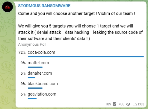 Stormous เป็นกลุ่มแฮกเกอร์ที่ใช้โปรแกรมเรียกค่าไถ่หรือ Ransomware แต่ตอนนี้พวกเขาขยับมาเป็นกลุ่มแฮกเกอร์ขโมยข้อมูล (Extortion) และในตอนนี้ยังมีการเปิดโหวตเป้าหมายที่พวกเขาจะแฮกต่อไป