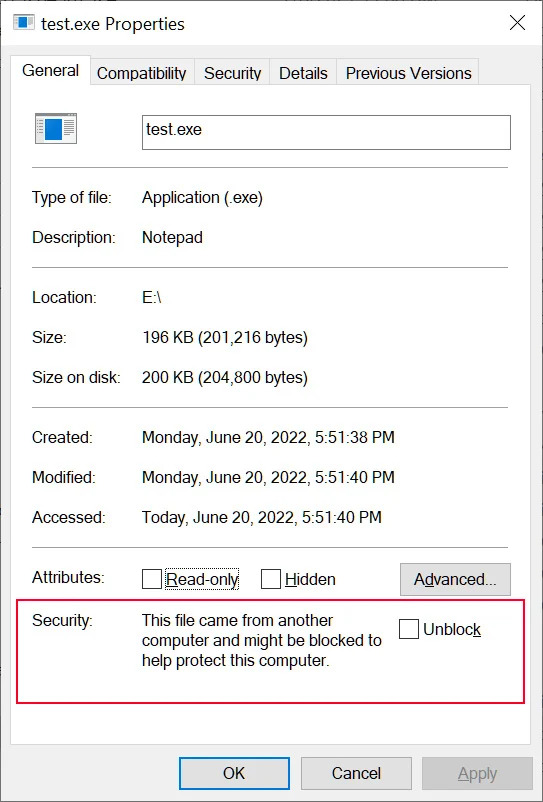 ในหน้า Properties ผู้ใช้สามารถเลือก Unblock และ Apply เพื่อถอน MoTW จากไฟล์ได้
